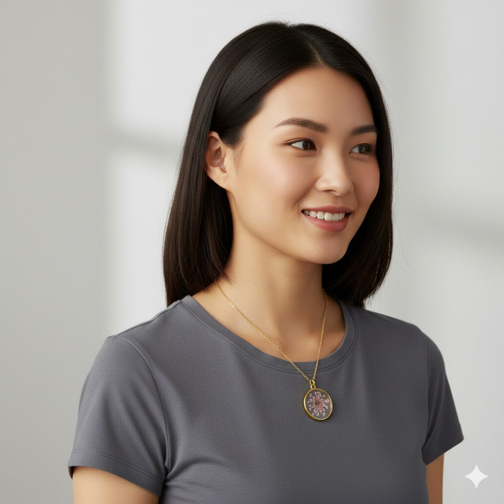 "La dolcezza di un fiore che non appassisce mai." Questa collana cattura l'essenza del romanticismo naturale. Al centro del design, il classico fiore di Regina Anna (Daucus Carota) si tinge di una delicata sfumatura Rosa, trasformando la complessità botanica in un gioiello che parla di gentilezza e femminilità. È l'accessorio perfetto per chi ama i dettagli sognanti e raffinati.