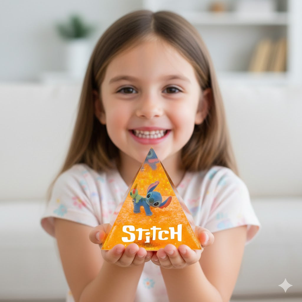 Porta il calore delle Hawaii e la dolcezza dell'Ohana sulla tua scrivania. Questa piramide in resina cattura un momento di pura allegria: Stitch, l'alieno blu più amato di sempre, porta a spasso sulla schiena il suo inseparabile amico Scrump.